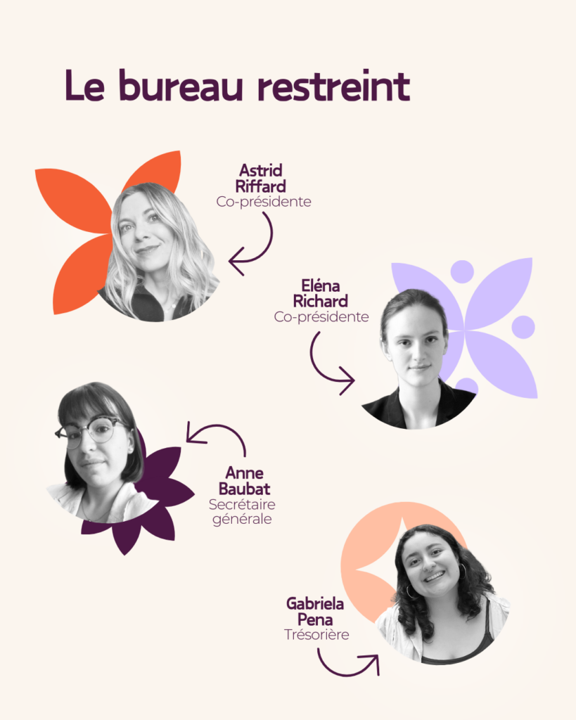 L’association est portée par un bureau restreint bénévole, composé de femmes engagées aux parcours variés, issues des IEP et investies dans la gouvernance associative.